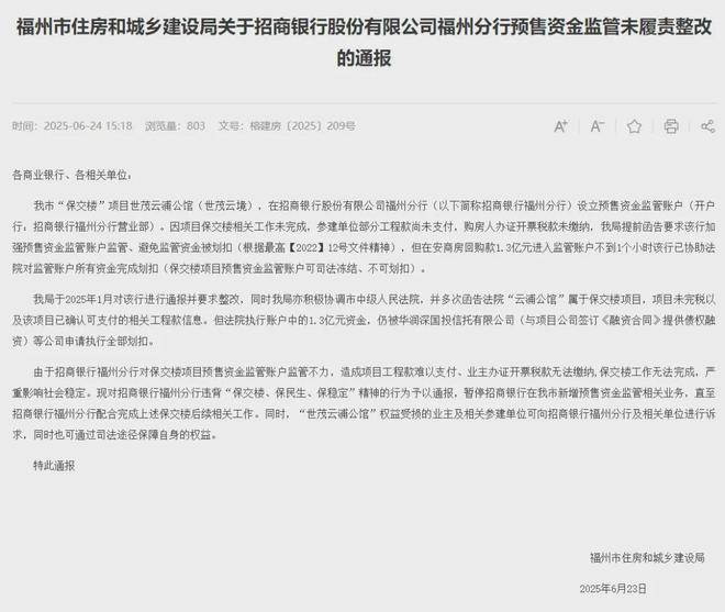 6月23日,福州住房城乡建设局在官网发布《关于招商银行股份有限公司福州分行预售资金监管未履责整改的通报》,点名招商银行福州分行在“保交楼”相关工作未完成且已发函提醒的情况下,仍将1.3亿元资金协助法院划扣,甚至回购款进入监管账户还不到1个小时。