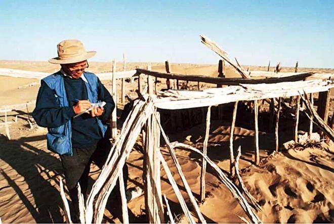 中日联合尼雅考古队队长王炳华在尼雅遗址。供图/王炳华著《楼兰尼雅》