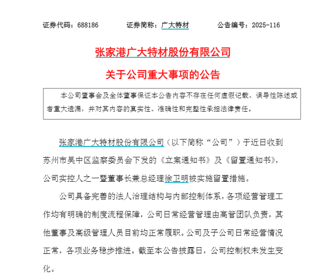 10月14日消息,广大特材(688186.SH)10月14日晚公告,公司于近日收到苏州市吴中区监察委员会下发的《立案通知书》及《留置通知书》,公司实控人之一暨董事长兼总经理徐卫明被实施留置措施。