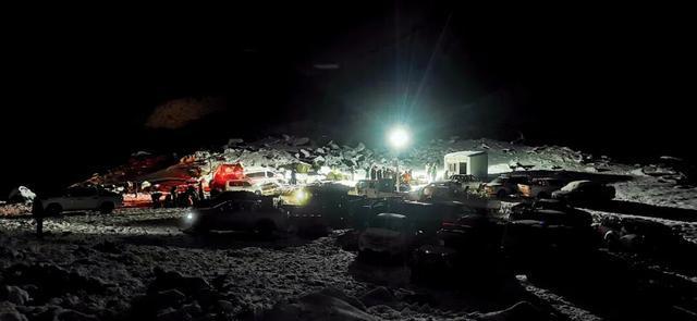 10月6日夜间,珠峰东坡,救援车辆及人员在徒步出口地接应点待命。图/受访者提供