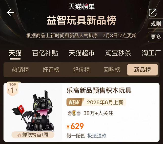 7月1日,乐高新品“无牙仔”积木正式上市,这款产品是正在热映的真人电影《新·驯龙高手》中的热门IP,也是乐高集团面向成年玩家推出的Icons 系列。淘宝官方旗舰店显示,该产品售价629元。发售前,乐高新产品“无牙仔”在社交平台上热度不低,目前处于天猫益智玩具新品榜首位,淘宝APP显示,“有38万+人关注”。