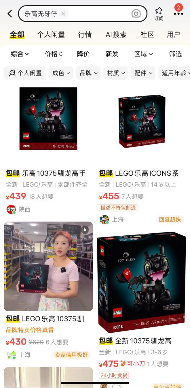 7月3日消息,知名玩具生产商乐高近日发售新品“无牙仔”积木,淘宝官方旗舰店售价629元,但发现,在二手平台上,不少卖家正以低于官方售价约200元的价格出售该新品。