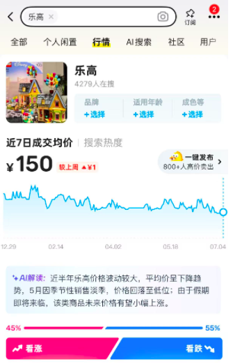 闲鱼平台显示,近半年乐高价格波动较大,平均价呈下降趋势,5月隐季节性销售淡季,价格回落至低位,假期即将来临,该类商品未来价格有望小幅上涨。