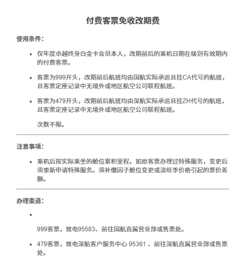 国航官网显示,凤凰知音包括银卡、金卡、白金卡、终身白金卡及卓越白金卡权益,卓越白金卡包含升级券、国际国内航班头等舱升舱券、付费客票免收改期费等权益。根据规定,付费客票免收改期费,仅年度卓越终身白金卡会员本人,改期前后的乘机日期在级别有效期内的付费客票,使用次数不限,须补缴因子舱位变更或淡旺季价格引起的票价差额。