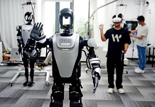 2025年3月27日,广东深圳一家机器人技术公司内,工作人员在操控机器人同步动作。图/新华