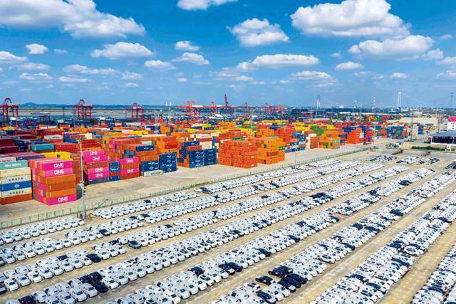 2025年10月23日,江苏南京港龙潭港区,等待装船出口的大批新能源汽车。图/中新
