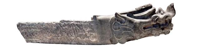 这件螭首长达192厘米,前半部分是一尊龙头,獠牙尽显,威风凛然,后半部分为方形石头。在铜雀台上,其后身插入夯土台内,龙头昂扬外露。彼时,想必有一排排螭首巍然列阵,嵌在石刻围栏里,烘托起铜雀台的豪劲之风。
