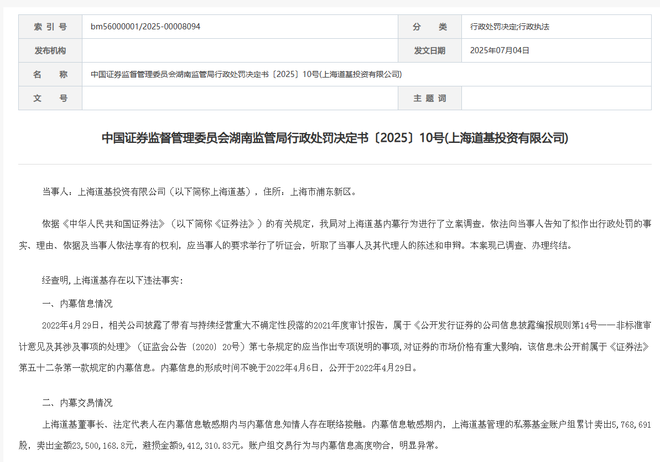 7月5日消息,湖南证监局7月4日披露信息显示,上海道基投资有限公司(以下简称“上海道基”)因内幕交易行为受到处罚。