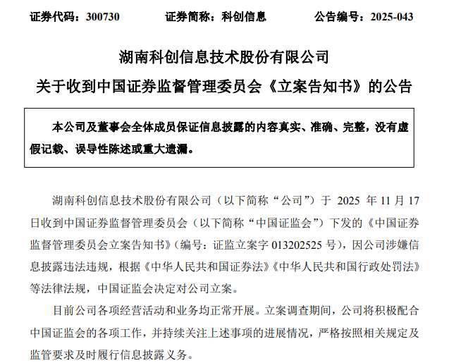 11月17日,科创信息(300730.SZ)发布公告称,公司于当日收到中国证监会下发的《立案告知书》,因公司涉嫌信息披露违法违规,中国证监会决定对公司立案。目前公司各项经营活动和业务均正常开展,将积极配合调查,并持续关注进展情况,及时履行信息披露义务。