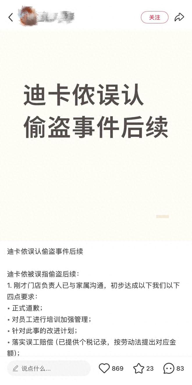 18日下午,该网友回应称,迪卡侬涉事门店负责人已与家属沟通,初步达成一致:要求对方正式道歉、加强员工培训管理、赔偿误工费等。