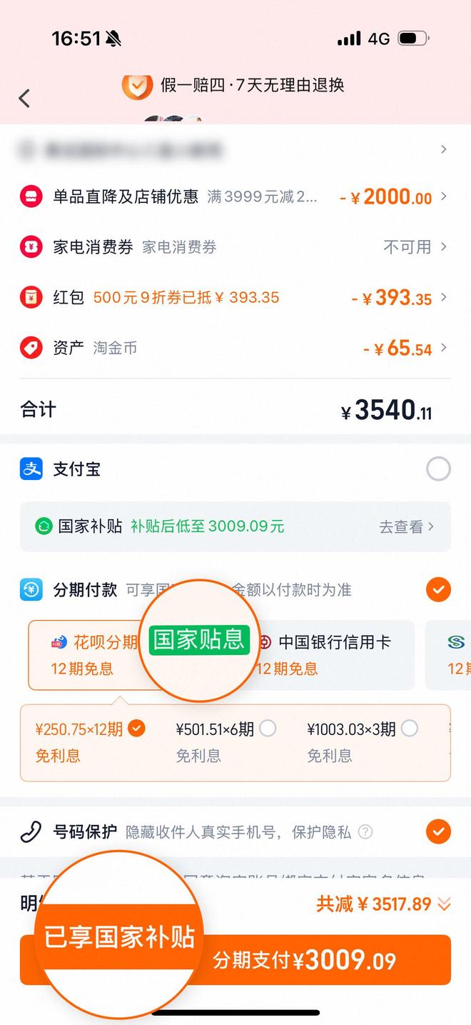 不仅如此,消费者在淘宝天猫平台上,选购手机数码、家电家具等国家“以旧换新”补贴政策范围内的商品,还可享受国家的双重补贴。以一款双开四门冰箱为例,原本的优惠价为4246元,先享受国家“以旧换新”补贴849.2元,再用花呗分期付款,享受由国家和商家共同贴息的12期免息,消费者每月仅需支付283元,就可以用上全新的冰箱了。