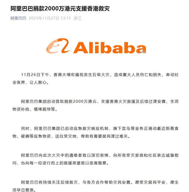 阿里巴巴(09988.HK)发文称,阿里巴巴集团启动首批捐款2000万港元,支援香港火灾救援及后续过渡安置、生活物资补给、情绪疏导等。