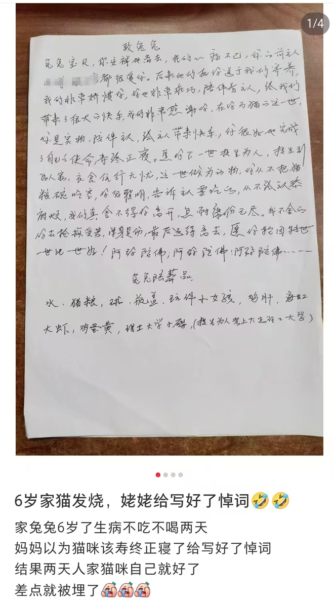 “不是写给我的是写给猫咪,我估计是想火化或者埋的时候一起处理了。”孙女士表示,最终自己父亲告诉了自己情况,最终发现是误会一场,目前猫咪情况已经好转。自己昨天晚上也和妈妈取得了联系。