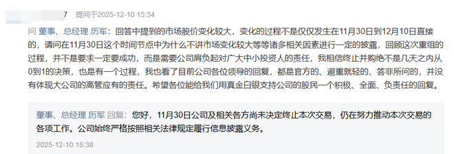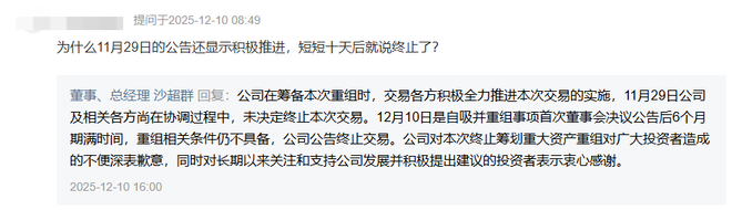 这也让不少投资者质疑信披是否及时。有投资者在交流平台提问称:“为什么11月29日的公告还显示积极推进,短短十天后就说终止了?”“(股价)变化的过程不是仅仅发生在11月30日到12月10日之间的,请问在11月30日这个时间节点中为什么不讲市场变化较大等等诸多相关因素,进行一定的披露。”