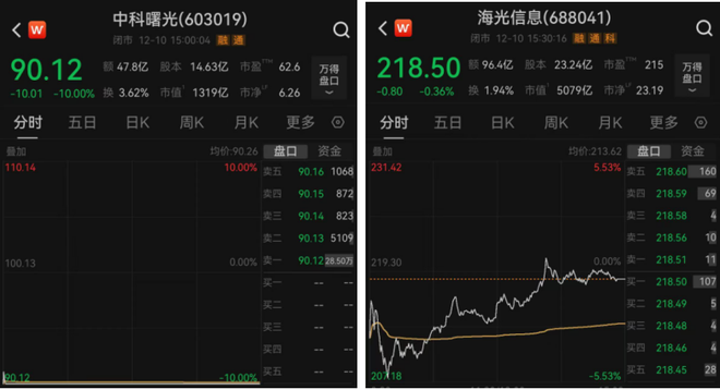 受合并终止消息影响,12月10日中科曙光股票“一字跌停”;海光信息早盘低开,一度跌超5%,后震荡回升,至收盘跌幅收窄至0.36%。