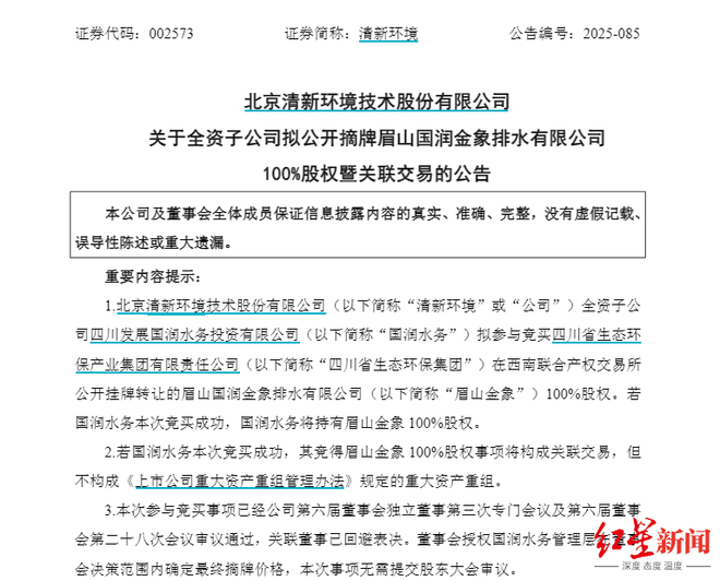 微成都报道 12月9日晚间,清新环境(002573.SZ)公告称,全资子公司四川发展国润水务投资有限公司(以下简称“国润水务”)拟“出手”竞买控股股东四川省生态环保产业集团有限责任公司(以下简称“四川省生态环保集团”)挂牌转让的眉山国润金象排水有限公司(以下简称“眉山金象”)100%股权。若国润水务竞买成功,将持有眉山金象100%股权。