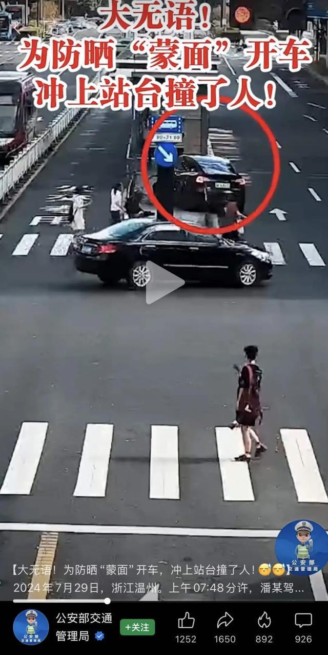 2024年7月29日,浙江温州就发生过一起因防晒面罩遮挡视线而造成的交通事故。一个司机头戴防晒面罩在驾驶小汽车行至路口左转弯时,视线受阻观察不周,直接冲上了路口BRT站台,除造成车辆受损、护栏损毁外,还将一名路人撞伤。