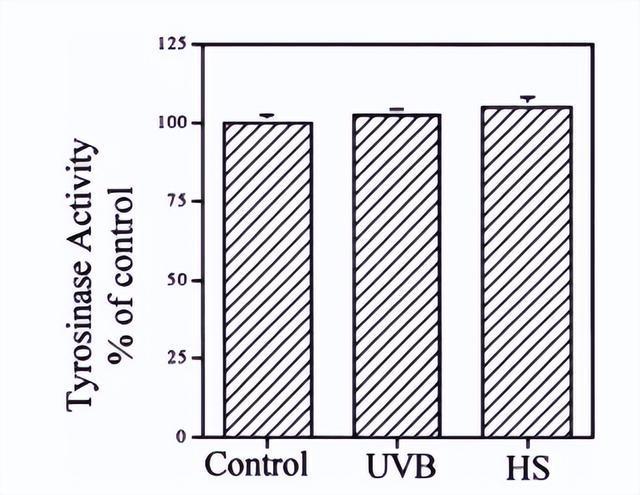 具体说来,热应激对黑色素的调控主要有两条“路径”,其中一条是热应激和 UVB辐射都能够显著提升酪氨酸酶活性。实验发现,热处理使酪氨酸酶活性提升了115.2%,而UVB组提升了108.6%,热应激的“效果”甚至超越了UVB。