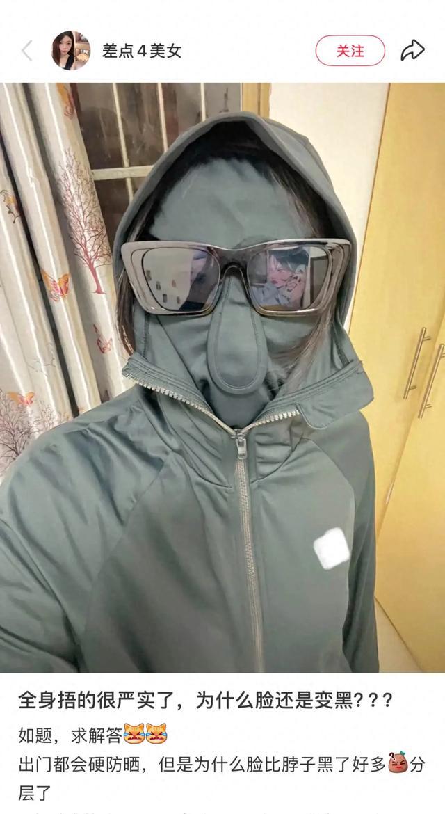 然而,防晒面罩好像也会起到反作用。当物理防御拉满后,有网友发出了灵魂考问:“全身捂得很严实了,为什么脸还是变黑?”