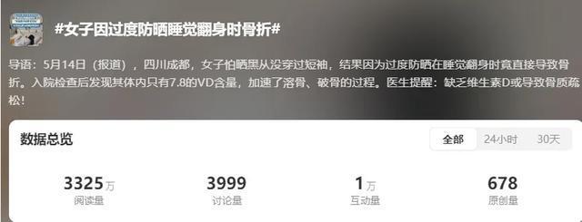 就比如,四川成都一位48岁的女子从不穿短袖且严格使用防晒产品,由于长期持续这种过度防晒的行为,导致她严重骨质疏松,在一次睡觉翻身时,轻微动作即引发骨折。入院检查后发现其体内维生素D含量只有7.8ng/ml(正常参考值20—50ng/ml)。