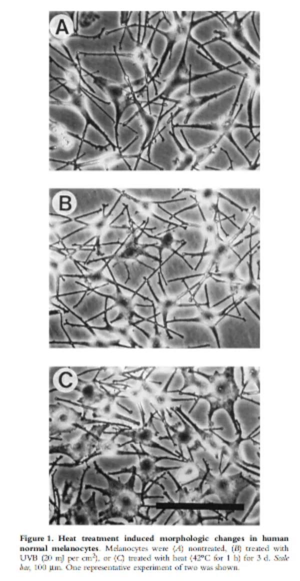 1998年,法国就有相关研究发现热应激(42℃)和 UVB(紫外线)辐射对人体黑色素细胞功能具有相似的调控作用,甚至热应激的作用更明显。