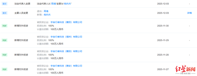 注意到,从11月27日到11月30日,宇宙行者新增了多笔对外投资,对惠安、莆田、福州三家全资子分公司的认缴出资额均为100万人民币。12月3日,执行公司事务的董事,经理高境退出,由倪兵兵接任。公司法定代表人由高境变更为倪兵兵。