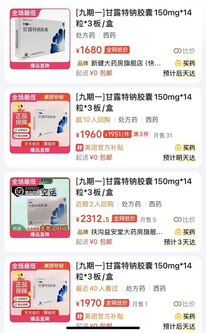 在多个电商平台看到,目前仅少数商家有甘露特钠胶囊在售,价格1680元到2500元不等(150mg*14粒*3板/盒)。这比被纳入医保时每盒296元的价格高出不少。