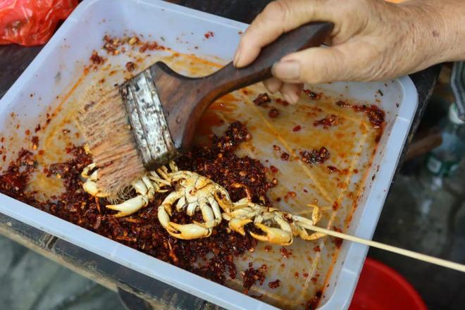 德夯大峡谷的山螃蟹不仅喂野了当地人的胃,还吸引了很多游客。在苗寨附近的小峡谷中,隔一段距离就能遇见炸螃蟹的老人或小孩。他们坐在小马扎上,面前放着煤炉和小铁锅,旁边的小桶装的是刚从小溪里抓的山螃蟹。碰到顾客,他们便用竹签串上三五只小螃蟹,放入油锅中炸至金黄,再在调好的辣椒油中滚上一圈,一串苗家风味的炸螃蟹便制作完成。这种螃蟹虽肉质不多,但品尝的是那嘎嘣脆香的独特氛围。