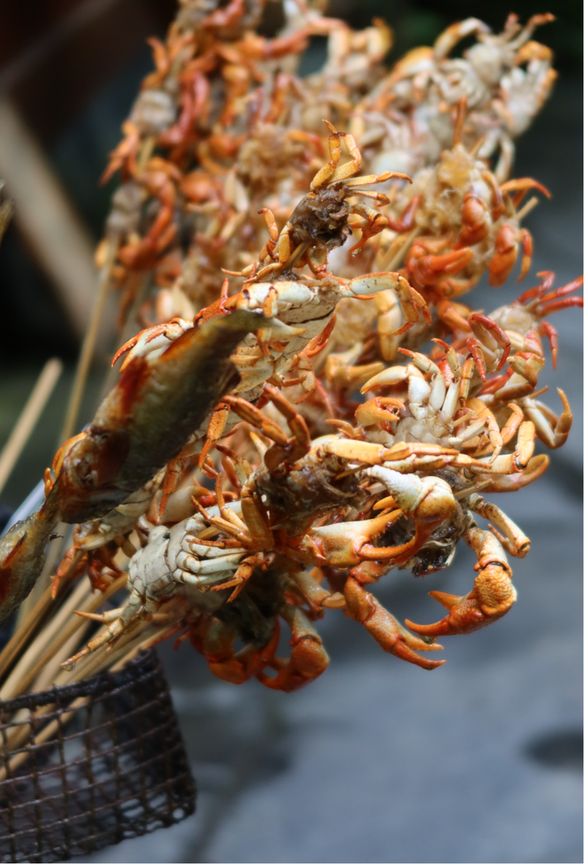 但在德夯苗寨,最常见的吃法是做成香辣小螃蟹或油炸小螃蟹。它是苗家人百虫宴的“招牌菜”。在苗家人吃虫的“日历表”中,桃花虫、桃花虾之后便是小螃蟹。小螃蟹剥去坚硬外壳,处理掉内脏后,直接放入油锅中炸至金黄酥脆,撒点辣椒粉即可作为零食。此外,螃蟹还可与干辣椒或青红辣椒同炒,加入大蒜和生姜,出锅便是一碗色香味俱全的香辣小螃蟹。这也是苗家人待客的时令佳肴。