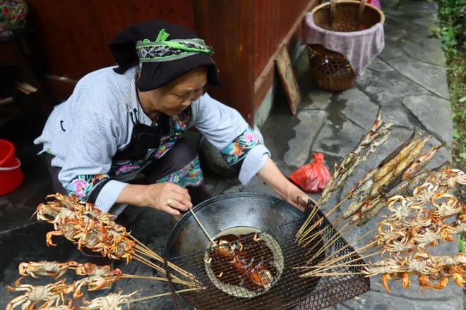 苗家人的家园宛如一个“森系宇宙”。这里以山水为灵魂,各类动植物为精髓,共同构筑起一个神秘而独特的“小世界”。在这片天地间,千百年来,每逢夏季,山涧溪流中的小螃蟹便成为人们的心头好。它不仅是孩童们的玩伴,更是苗家人餐桌上用以解馋的佳肴。此外,它还现身于苗族服装的纹饰图案中,点缀在苗族银饰之上,甚至融入苗族的神话传说,乃至成为图腾象征。