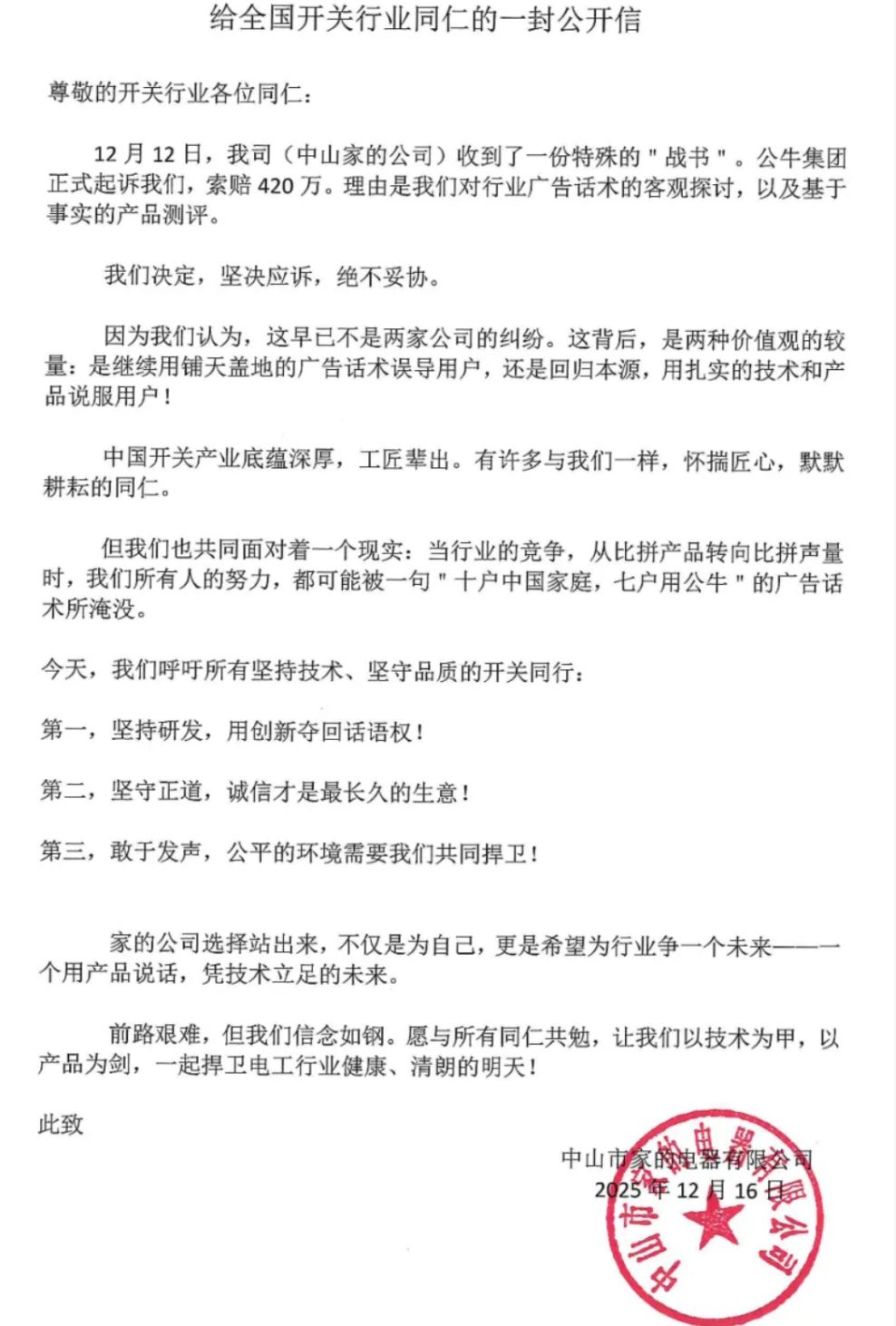 家的电器在公开信中强调,这件事不只是两家公司之间的纠纷,而是两种价值观的较量——是继续用铺天盖地的广告话术误导用户,还是用技术和产品说服用户。“有许多与我们一样的(中国开关企业)默默耕耘,但共同面对着一个现实:当行业竞争从比拼产品转向比拼声量时,我们所有人的努力,都可能被一句‘10户中国家庭,7户用公牛’的广告话术所淹没。”