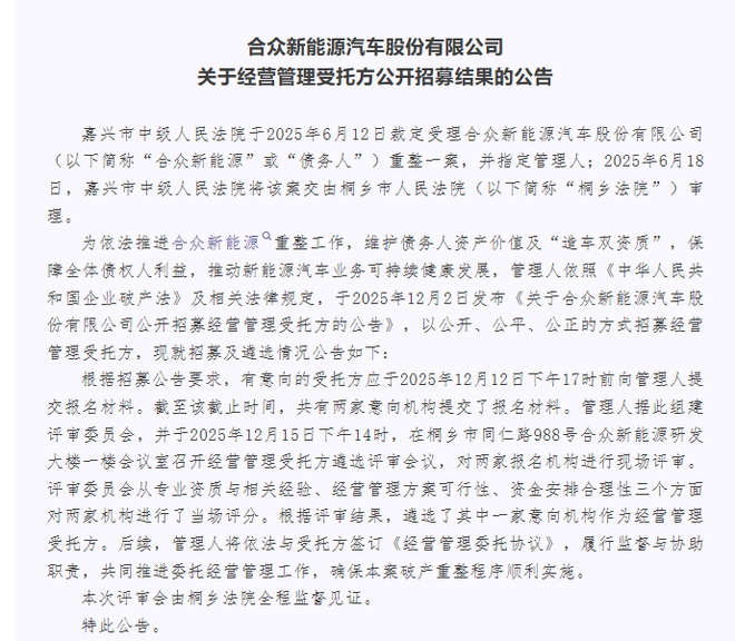 12月18日消息,今日,哪吒汽车母公司合众新能源发布关于经营管理受托方公开招募结果的公告。公告提到,共有两家意向机构提交了报名材料。评审委员会从专业资质与相关经验、经营管理方案可行性、资金安排合理性三个方面对两家机构进行了当场评分。