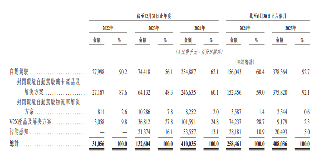 分业务看,2022年至2024年及2025年上半年,自动驾驶矿卡业务收入分别为2718.7万元、6413.2万元、2.47亿元、3.76亿元,占总收入的比重分别为87.6%、48.3%、60.1%、92.1%。