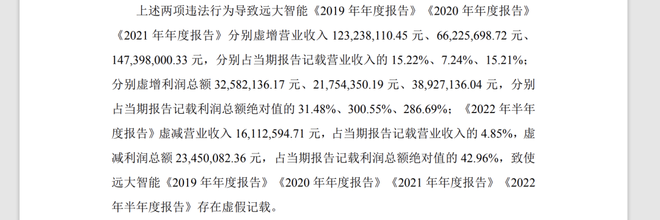 此外,2022年半年度,远大智能虚减营业收入1611.26万元,占当期报告记载营业收入的4.85%;虚减利润总额2345万元,占当期报告记载利润总额绝对值的42.96%。公司4期财报均存在虚假记载。