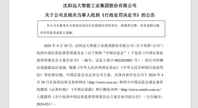12月21日消息,12月19日晚间,沈阳远大智能工业集团股份有限公司(002689.SZ;下称“远大智能”)发布关于公司及相关当事人收到《行政处罚决定书》的公告。