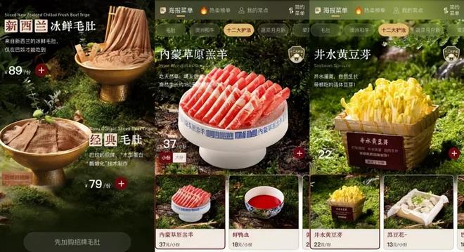 比如工艺,招牌经典毛肚采用“木瓜蛋白酶嫩化”技术制作;比如产地,新西兰冰鲜毛肚“仅在巴奴才能吃到”,柞水木耳是地理标志保护产品;比如原料,内蒙草原羔羊“吃天然草喝天然水,自然生长约180天”,井水黄豆芽“井水灌溉,自然生长”。