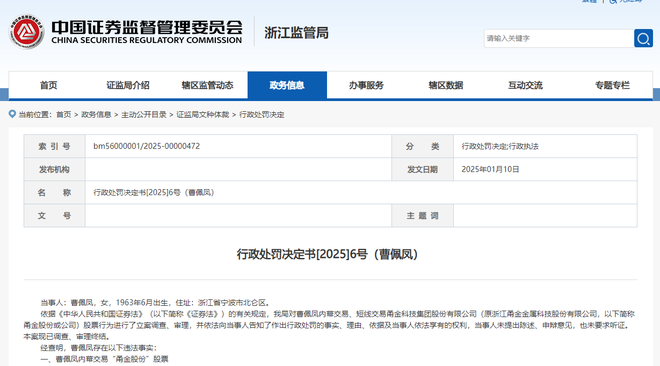 2024年8月,曹佩凤因涉嫌内幕交易、短线交易被证监会立案调查。经过接近半年的调查,今年1月,浙江证监局下发《行政处罚决定书》,对曹佩凤的违法行为作出处理。
