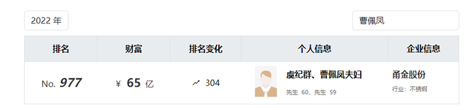 曹佩凤、虞纪群夫妇二人均是浙江知名民营企业家,曾于2020年以43亿元财富首度位列《胡润百富榜》第1305位;2021年以56亿元财富位列《胡润百富榜》第1281位;此后又于2022年,以65亿元财富位列《胡润百富榜》第977位。