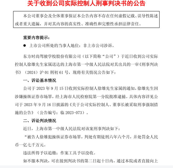 7月12日消息,7月11日晚间,“驾校第一股”东方时尚驾驶学校股份有限公司(ST东时,603377.SH,以下简称“东方时尚”)公告称,公司于近日收到实控人徐雄家属送达的上海市第一中级人民法院出具的一审《刑事判决书》(2024)沪01刑初61号。