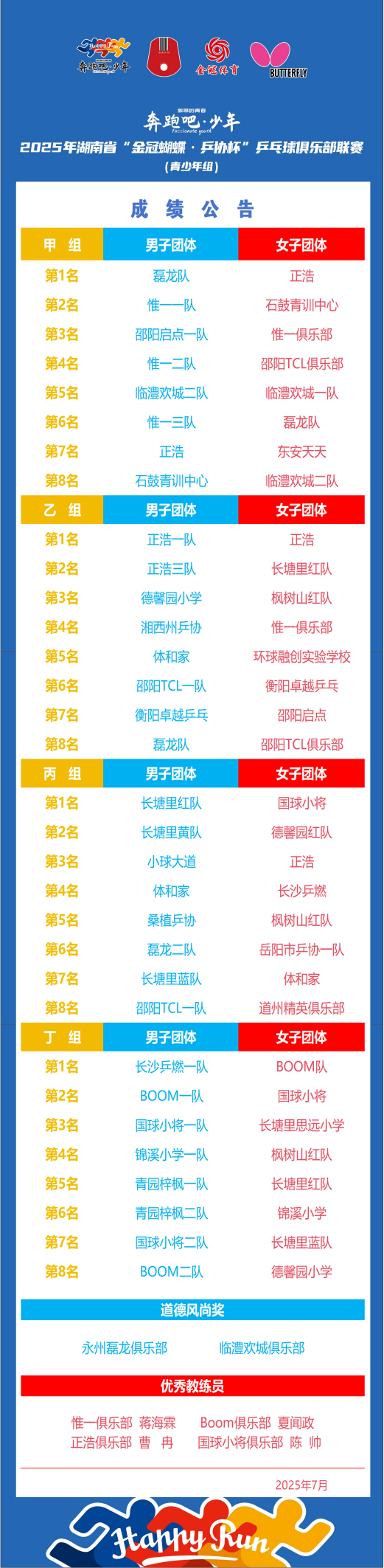 7月12日,"奔跑吧·少年"2025年湖南省"金冠蝴蝶·乒协杯"青少年乒乓球俱乐部联赛圆满收官。