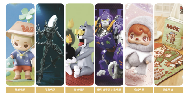 招股书显示,截至去年末,52TOYS拥有NOOK、Sleep、Lilith、猛兽匣、Panda Roll(胖哒幼)等35个自有潮流、科幻及文化IP,以及《蜡笔小新》《猫和老鼠》《小黄人》等80个授权IP;产品矩阵横跨静态玩偶、可动玩偶、发条玩具、变形机甲、拼装玩具、毛绒玩具、衍生周边(如耳机壳、纪念章、磁铁)等。