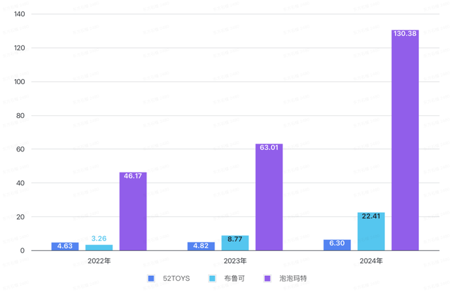 2022—2024年,52TOYS营收分别为4.63亿元、4.82亿元、6.30亿元,其复合年增长率为16.77%。同期内,泡泡玛特营收从46.17亿元增长到130.38亿元,增长率为68.04%;布鲁可则从3.26亿元增至22.41亿元,增长率为162.19%。