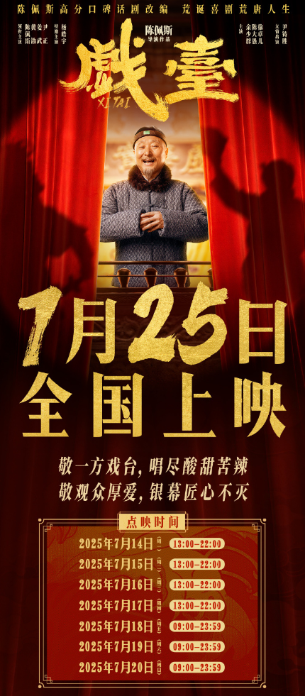 随着姜文和大鹏双双提档,原本定档于7月17日上映的陈佩斯执导的《戏台》随后官宣换档,调整至7月25日上映。