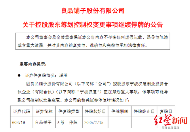 公告称,公司近日收到控股股东宁波汉意创业投资合伙企业(有限合伙)(以下简称“宁波汉意”)通知,其正在筹划重大事项,该事项可能导致公司控制权发生变更。目前,宁波汉意正与相关方积极推进本次事项的各项工作,公司预计无法在2025年7月15日(星期二)开市起复牌。根据相关规定,经公司向上海证券交易所申请,公司股票(证券代码:603719,证券简称:良品铺子)将于2025年7月15日(星期二)开市起继续停牌,预计继续停牌时间不超过3个交易日。