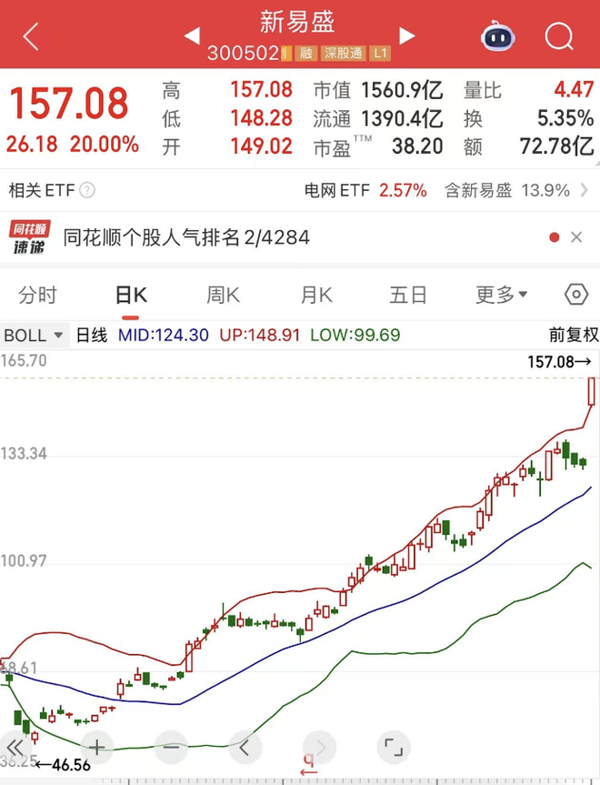 受业绩利好影响,7月15日,新易盛开盘大涨,9时40分股价涨停,涨幅20%,成交金额超60亿元,每股报157.08元,总市值1561亿元。今年4月9日以来,新易盛股价累计涨幅超200%。