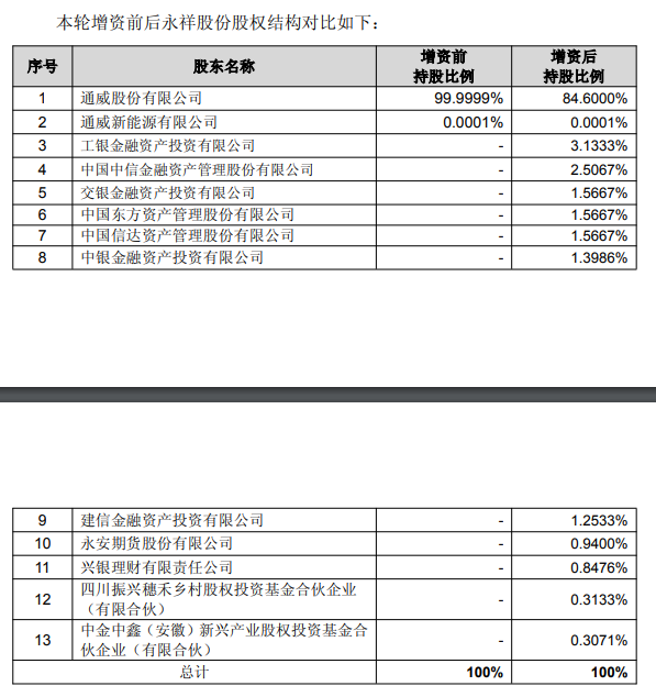 本次战略投资者股权增资款合计约49.16亿元。增资完成后,通威股份方面的持股比例被稀释至84.60%,但仍保持控股权,新投资者则合计持股15.40%。永祥股份已于近日完成工商变更登记手续。