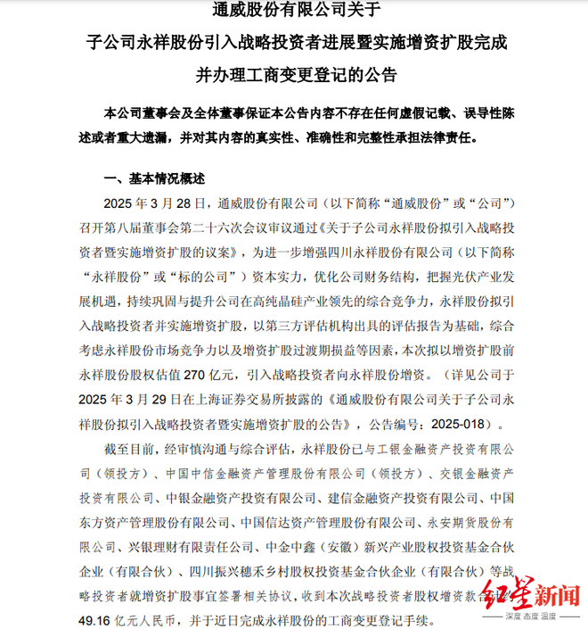 四川今年最大融资揭晓!通威旗下永祥股份逆势获49亿投资
