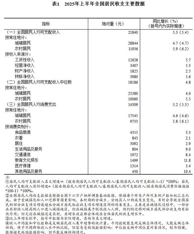 国家统计局:上半年全国居民人均可支配收入21840元,比上年同期名义增长5.3%