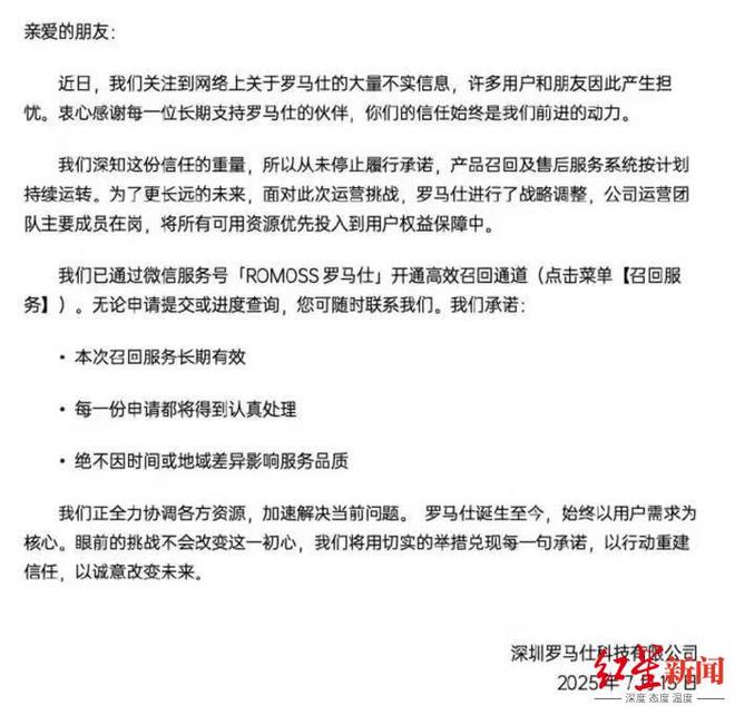 7月15日消息,宣布停工停产6个月后,罗马仕今日再发声明,称公司运营团队主要成员在岗,召回服务长期有效。