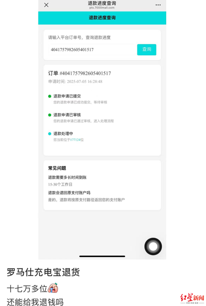 在罗马仕微信服务号中,有专门的“召回”板块,其中可以查询召回产品范围和退款进度。注意到,有网友于7月7日发文,其晒出的退款进度显示,排队位置在17万名之外。